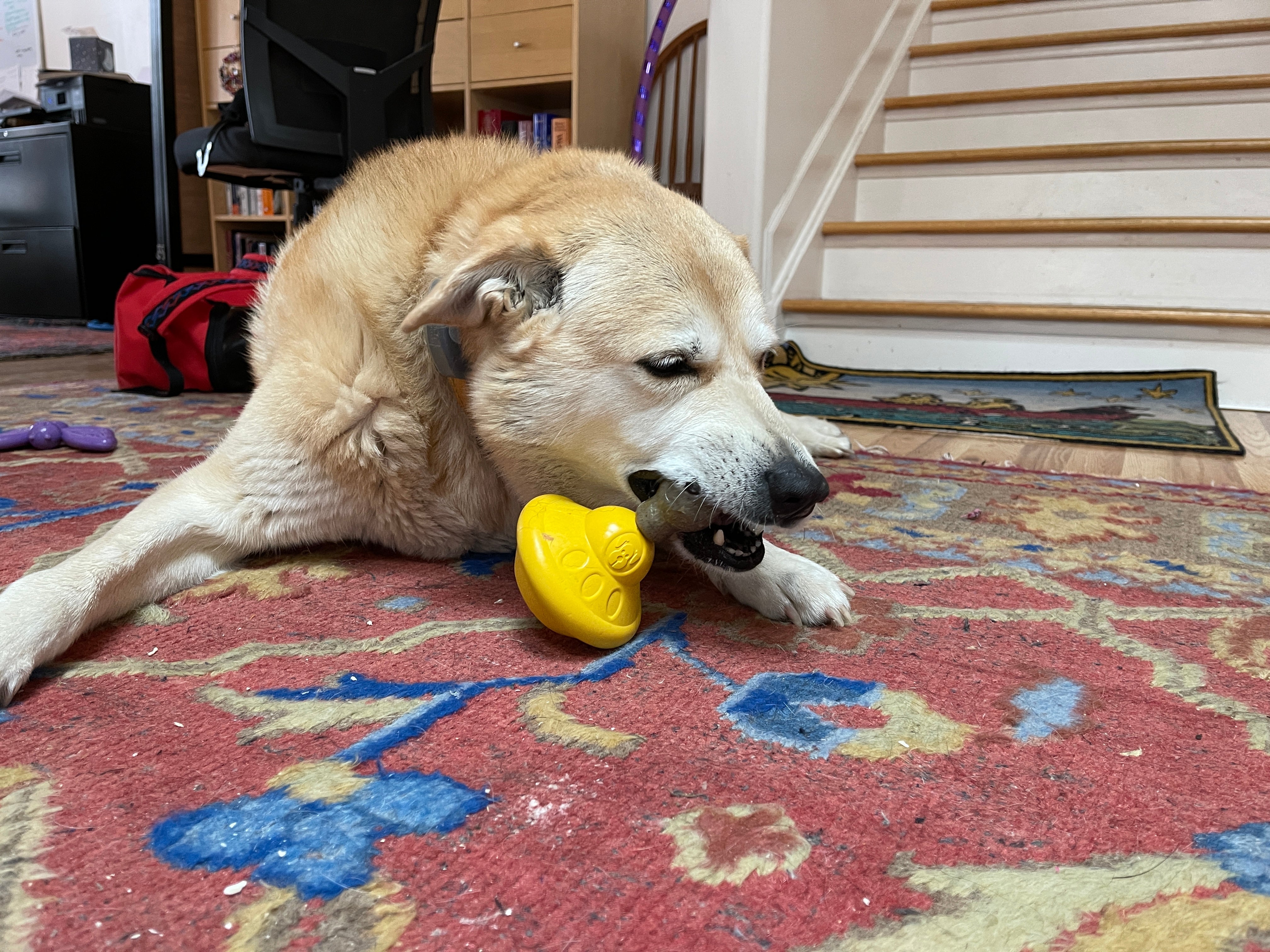 Supervise dogs while playing with this toy. Inspect toy frequently. Remove damaged toys. Replace worn or damaged toys or if it becomes too small to chew safely. This product is not intended to be eaten or swallowed. If your dog swallows a piece, take this toy away and contact your veterinarian.